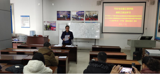 根据学校新型冠状病毒感染的肺炎疫情防控工作领导小组办公室的安排部署,2021年1月12日下午3点,汽车与交通工程学院全体教职工在3-102会议室集中学习了《广西壮族自治区新型冠状病毒感染的肺炎疫情防控工作领导小组指挥部关于印发冬春季特别是春节期间疫情个人防护等7项“十严格”措施的通知》(桂新冠防指〔2021〕3号)等文件。