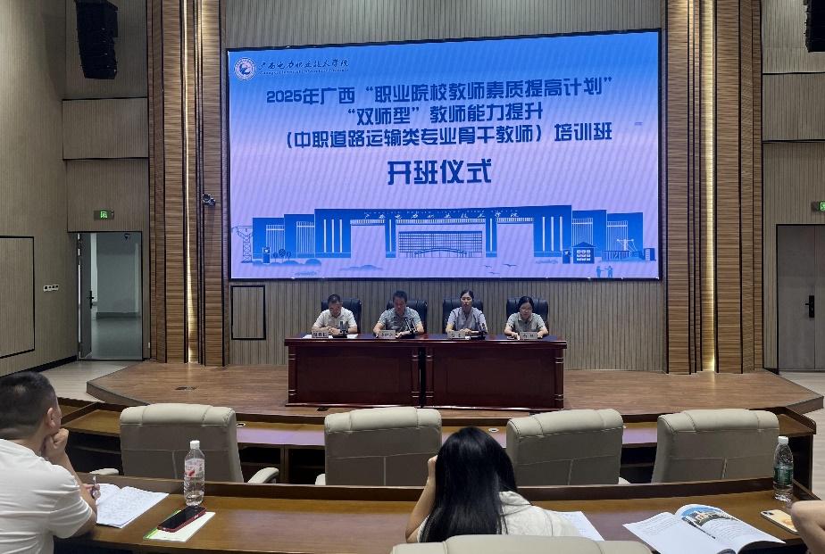 2025年8月18日上午,广西2025年“职业院校教师素质提高计划”项目教师企业实践“双师型”教师能力提升(中职道路运输类专业骨干教师)培训班开班仪式在五象校区举行。继续教育与培训学院副院长蔡艳,汽车与交通工程学院院长李健龙、副院长谢毅松、党政办公室主任曾慧出席仪式。来自全区23所中职学校以及南宁、柳州、桂林等13个地市的50名道路运输类专业青年骨干教师参加培训。