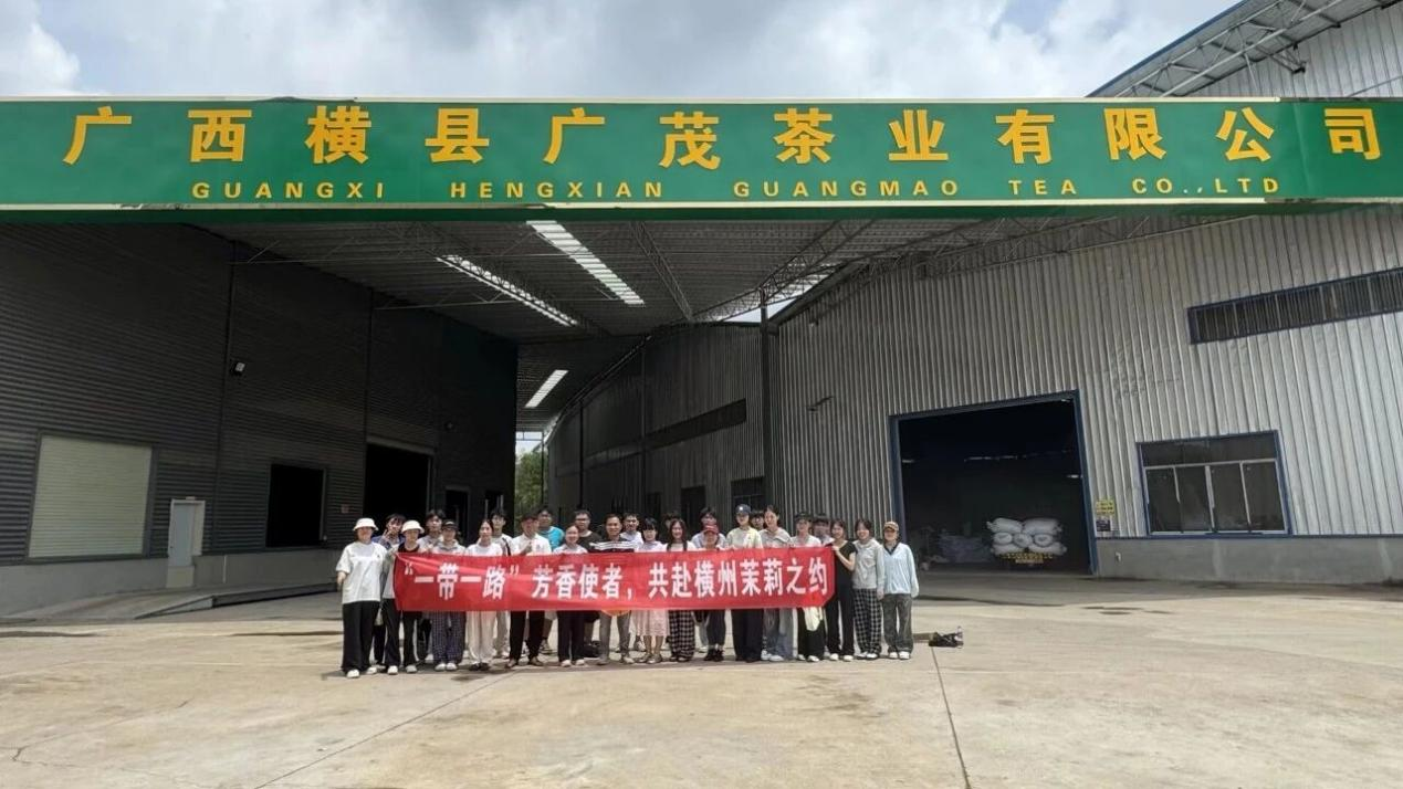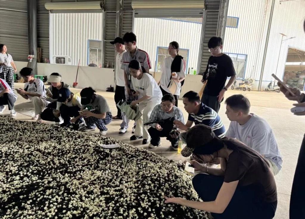 活动次日,团队走访茉莉花加工企业,实地观摩从鲜花采摘、窨制到成品包装的全产业链流程,深刻感受“一朵花”到“一条链”的价值跃升与品牌创新动力。在云表镇茉莉花种植基地,成员们实地查看作物长势,与种植户面对面交流产业增收实效。座谈会上,村干部系统介绍了当地“生态+经济”发展模式,通过推广经济林木种植实现生态效益与经济效益双赢,使同学们对“绿水青山就是金山银山”理念有了更鲜活的理解。